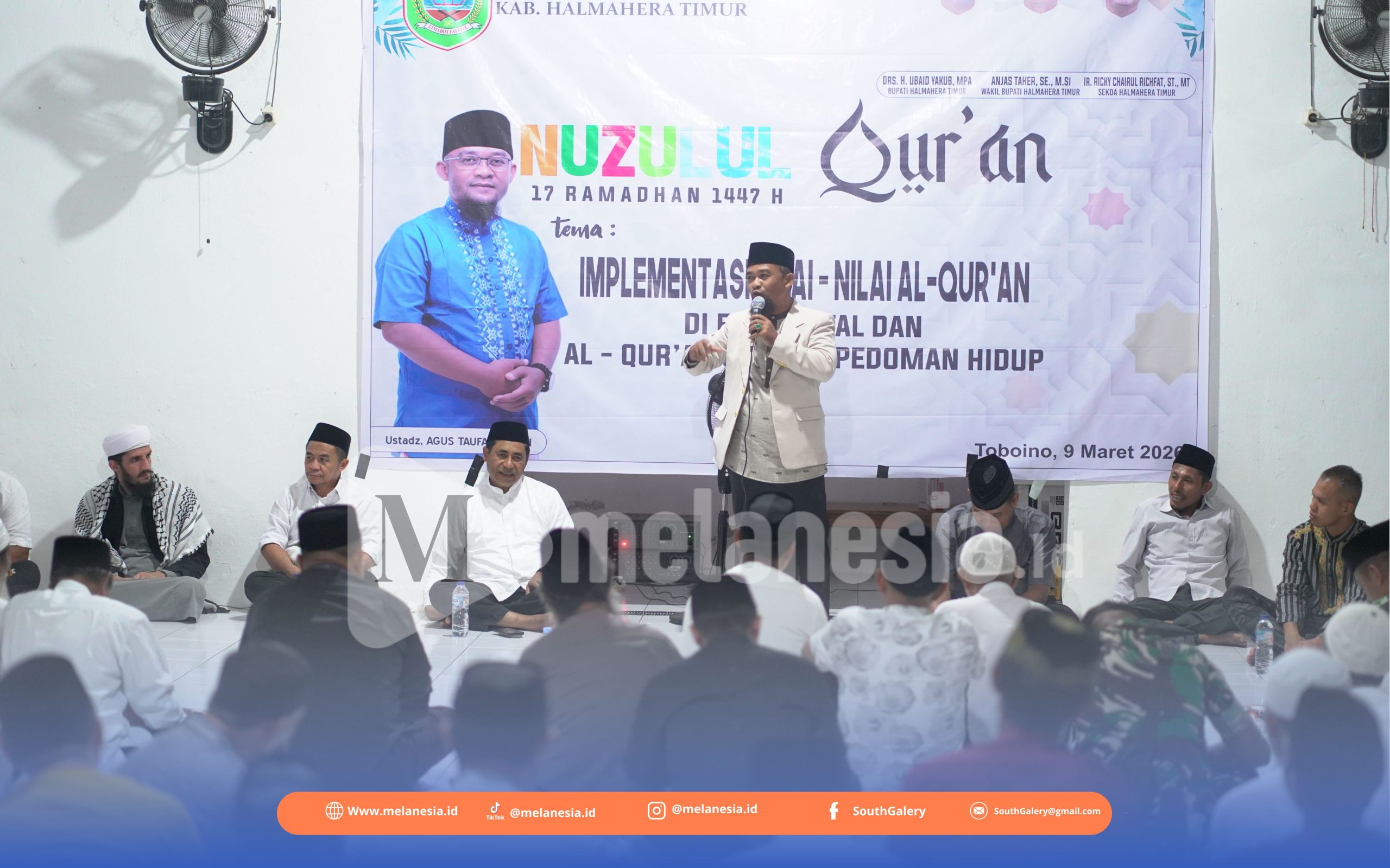 WASILE – Bupati Halmahera Timur (Haltim) Ubaid Yakub didampingi Wakil Bupati Anjas Taher dan Ketua TP.PKK Haltim Sittinur Ubaid menghadiri peringatan Nuzulul Qur’an yang digelar di Desa Toboino Kecamatan Wasile Timur,Senin (09/03/2026) oleh Bagian Kesra Setda Haltim.